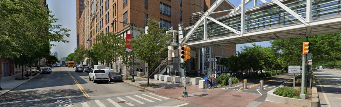 The proposed site for the pump station, Stuyvesant Plaza, is east of the existing 10-story Stuyvesant High School building, northwest of the Chamber Street and Route 9A/West Street intersection. There is an existing pedestrian bridge with an elevator crossing Route 9A/West Street, leading to the high school. North of the school building is the 20-foot-wide North Esplanade, with another existing bulkhead running along the north to south direction, then the Hudson River.